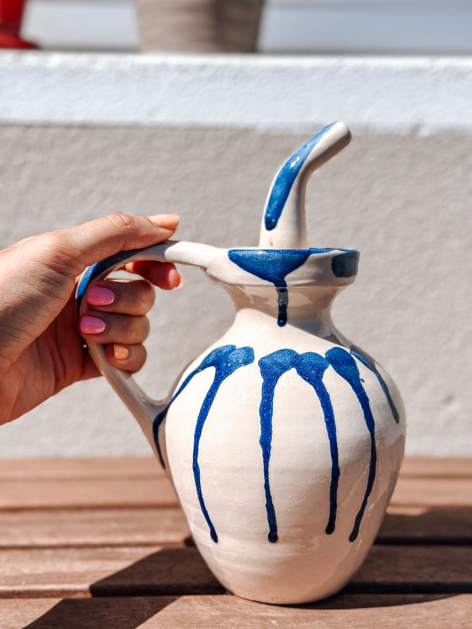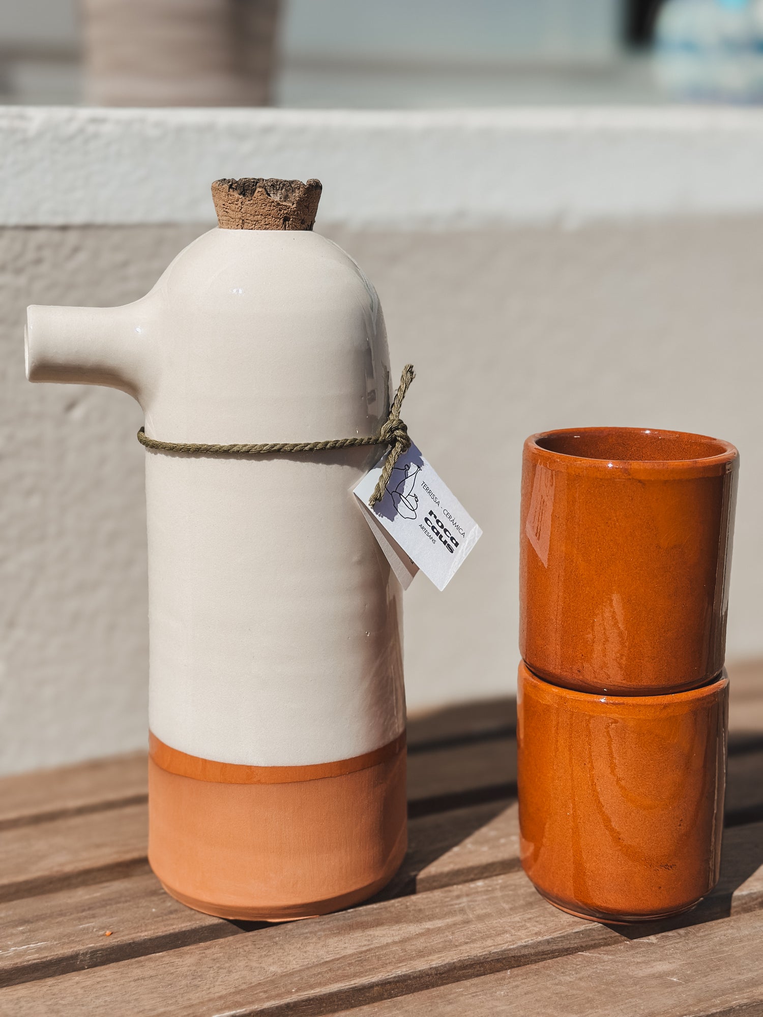 Pour, sip, and slow down. This elegant set includes one gerra (pitcher) and two matching gots (cups), handmade in Catalunya using traditional clay and a natural glaze. The design is simple yet striking — a blend of earthy terracotta and smooth ivory glaze that feels just as at home on a sunlit terrace as it does on your kitchen table.